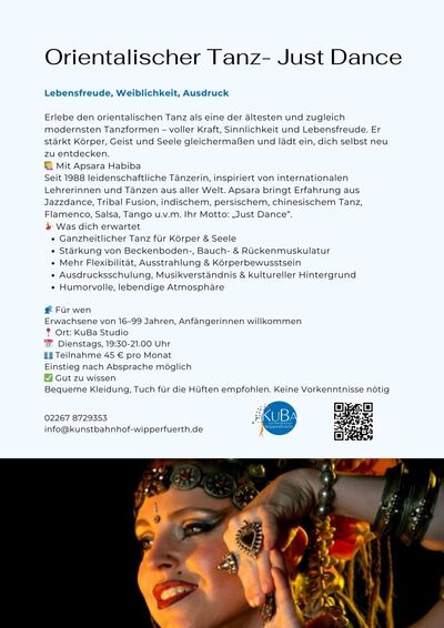| Information | Orientalischer TanzFrauenpower, Fitness, Spaß Unterricht für Weiblichkeiten von 16 bis 116 Jahre mit Apsara Habiba Jeden Dienstag ab Anfänger/innen Teilnahmegebühr: 45€ pro Monat Wir freuen uns auf Ihre Anmeldung unter: info@kunstbahnhof-wipperfuerth.de |