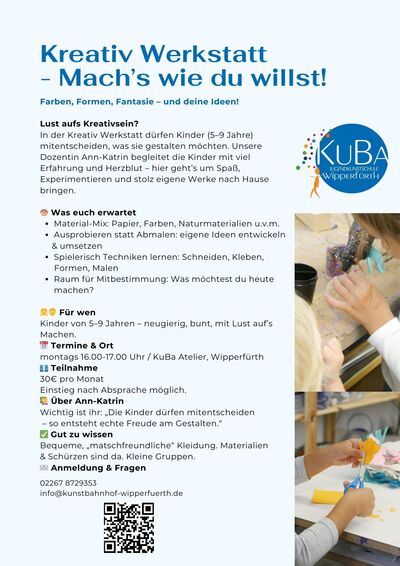 | Information | KreativwerkstattIhr zeichnet, malt oder gestaltet gerne? Ihr möchtet Eure Ideen verwirklichen oder seid auf der Suche nach neuen Anregungen? Dann seid ihr in diesem Kurs genau richtig! Jeden Montag für Kinder von 5-9 Jahre Teilnahmegebühr: 30€ pro Monat Wir freuen uns auf Dich! Anmeldung zum Schnuppern unter: info@kunstbahnhof-wipperfuerth.de |
