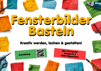 | Information | Wir gestalten gemeinsam schöne Fensterbilder nach Vorlage. Schritt für Schritt entstehen mit buntem Material tolle Motive, die jedes Fenster zum Strahlen bringen. Das Angebot richtet sich an Kinder und Jugendliche, die gerne kreativ arbeiten und etwas Eigenes gestalten möchten. Vorkenntnisse sind nicht nötig – einfach mitmachen und Spaß am Basteln haben! Am Ende nimmst du dein fertiges Fensterbild mit nach Hause und bringst Farbe ins Licht. Anmeldung über https://wipperfuerth.feripro.de/anmeldung/36/veranstaltungen/1099 |